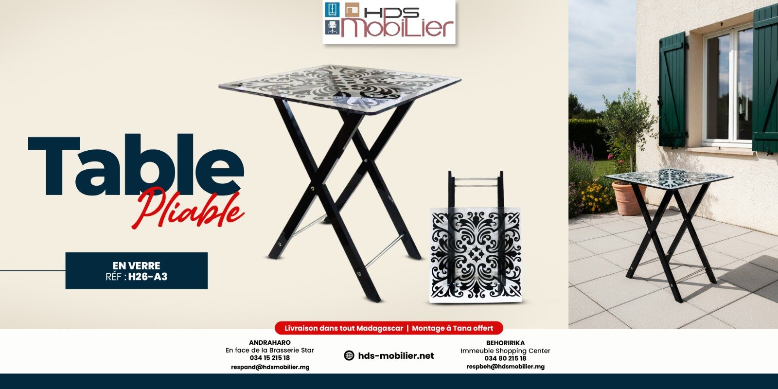 Sur la partie gauche, on voit en grand une photo studio de la table, qui est carrée avec un plateau en verre décoré d’un motif noir et blanc de style damassé. La table repose sur des pieds métalliques noirs en forme de croix. Une petite image montre la table en position pliée, ce qui met en avant sa praticité et son gain de place. Le texte indique le nom du produit « Table Pliable » et la référence « H26-A3 ».