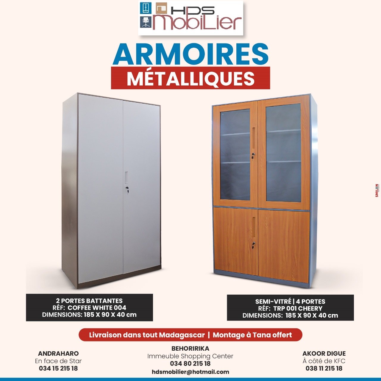 Découvrez notre gamme d’armoires métalliques, conçues pour répondre à tous vos besoins de rangement professionnel. Disponible en deux versions : une armoire à 2 portes battantes en couleur Coffee White, idéale pour un stockage simple et sécurisé ; et une armoire semi-vitrée à 4 portes, parfaite pour exposer vos documents ou objets tout en les protégeant. Fabriquées en métal robuste avec des dimensions standard de 185 x 90 x 40 cm, ces armoires offrent une solution durable et pratique pour votre espace de travail. Leur montage est offert et la livraison couvre tout Madagascar, avec une option d’installation incluse.