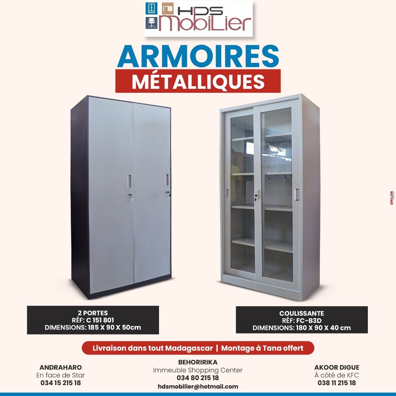 Découvrez notre gamme d’armoires métalliques, conçues pour répondre à tous vos besoins de rangement professionnel. Disponible en deux modèles : une armoire à 2 portes battantes en couleur gris clair, idéale pour un stockage sécurisé ; et une armoire coulissante à portes vitrées, parfaite pour exposer vos documents ou objets tout en les protégeant. Ces armoires sont fabriquées en métal robuste avec des dimensions respectives de 185 x 90 x 50 cm pour la version à 2 portes, et 180 x 90 x 40 cm pour la version coulissante. Leur montage est offert, et la livraison couvre tout Madagascar.
