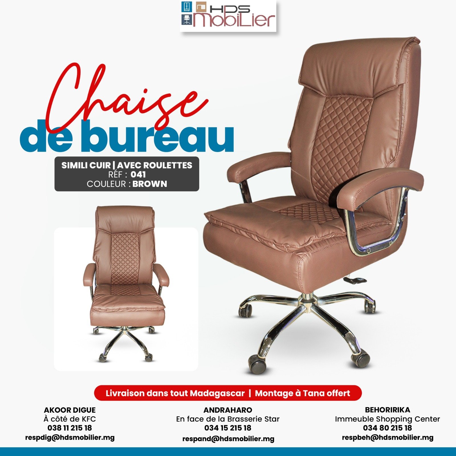 Cette publicité présente une chaise de bureau en similicuir de couleur marron, équipée de roulettes. La chaise arbore un design ergonomique avec un rembourrage confortable, notamment sur le siège et le dossier, qui est orné d’un motif de couture en losange au centre. Elle est conçue pour offrir un confort optimal lors de longues heures de travail. La chaise est équipée de bras rembourrés et d’une base robuste avec roulettes pour faciliter le déplacement.