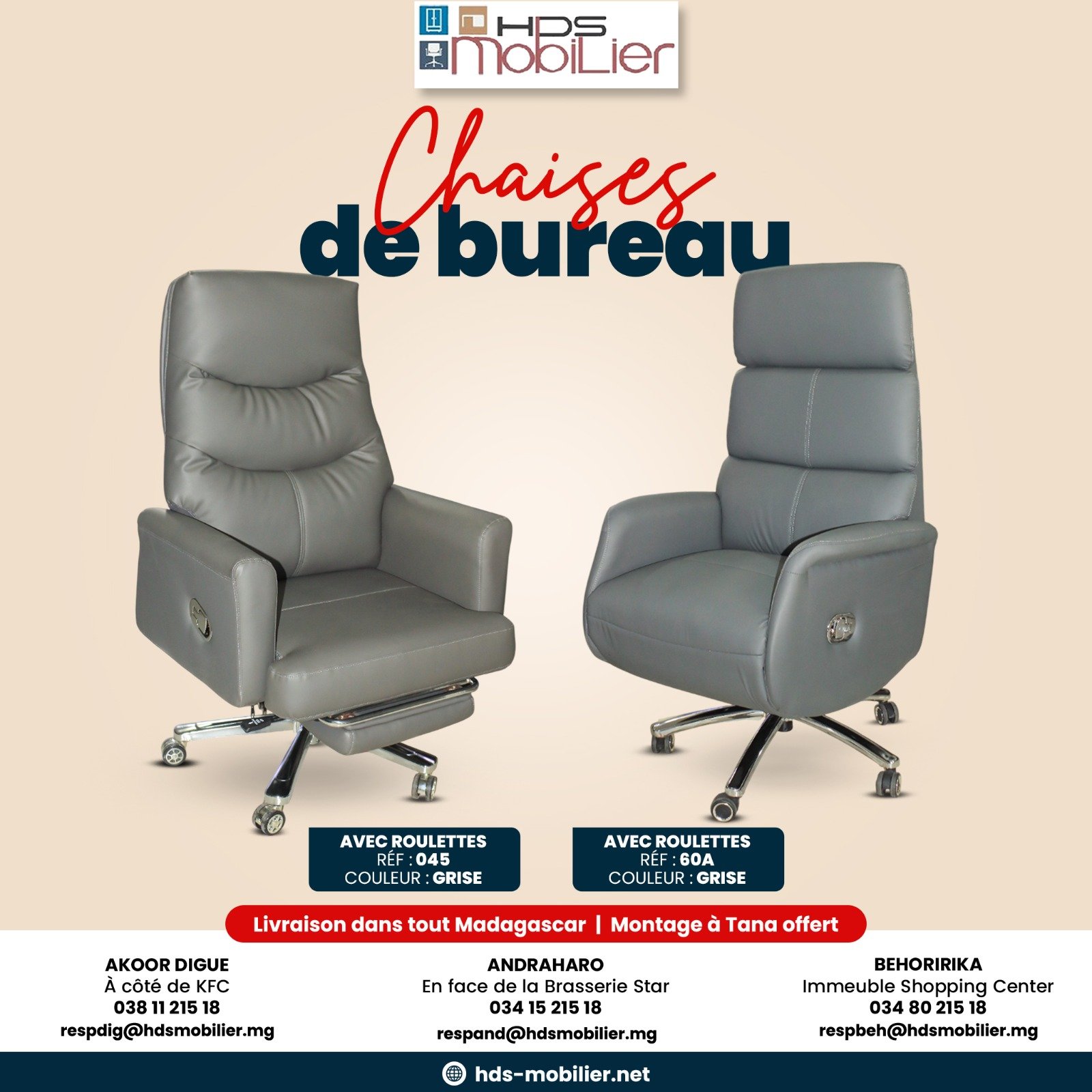 Au centre de l’image, on voit deux chaises de bureau grises avec roulettes. La chaise de gauche, référencée « R F : 045 », a un dossier rembourré en plusieurs sections et un repose-pieds intégré. La chaise de droite, référencée « R F : 60A », possède un dossier avec plusieurs bandes horizontales rembourrées.