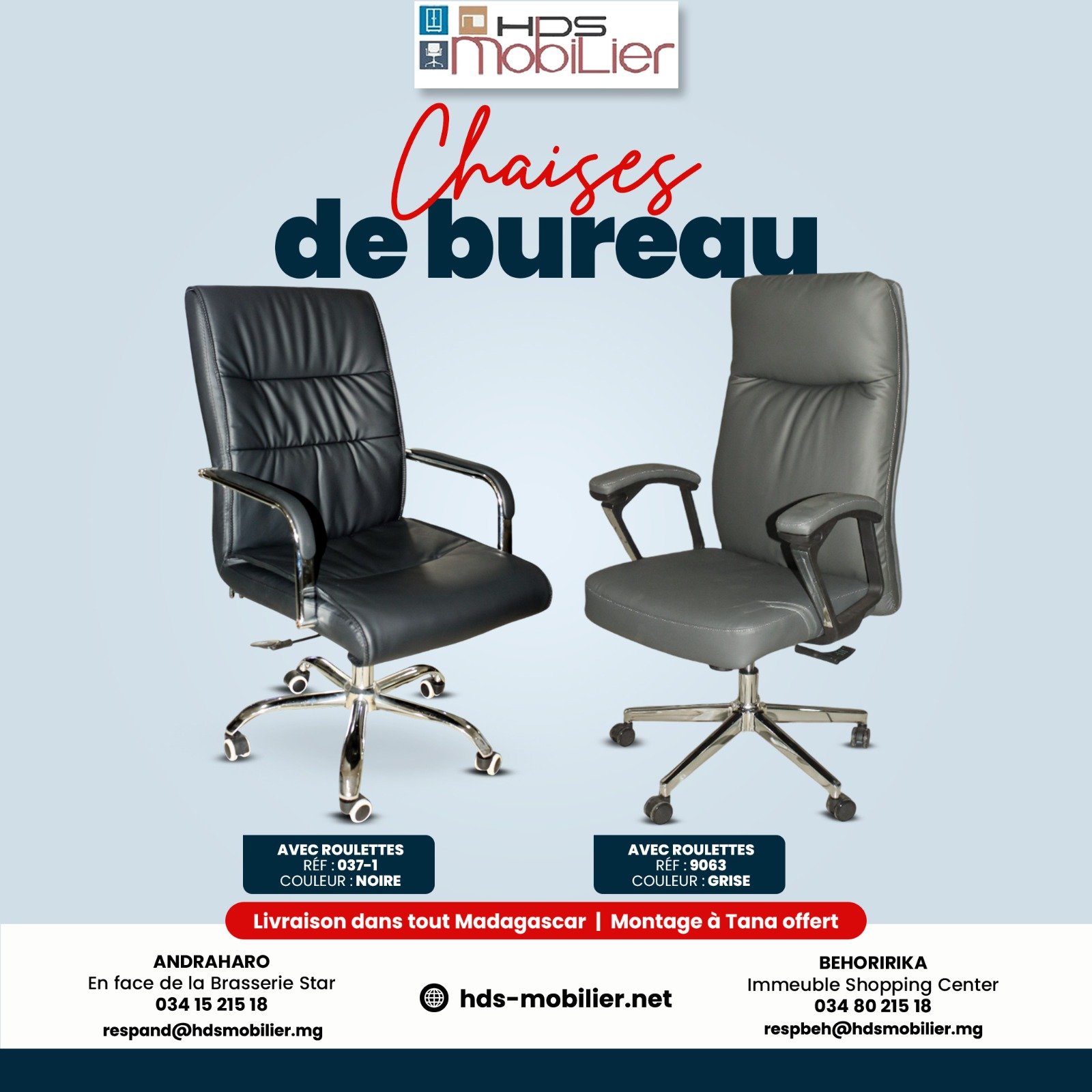 HDS Mobilier, spécialisée dans la vente de chaises de bureau. Au centre, deux chaises de bureau sont présentées côte à côte.