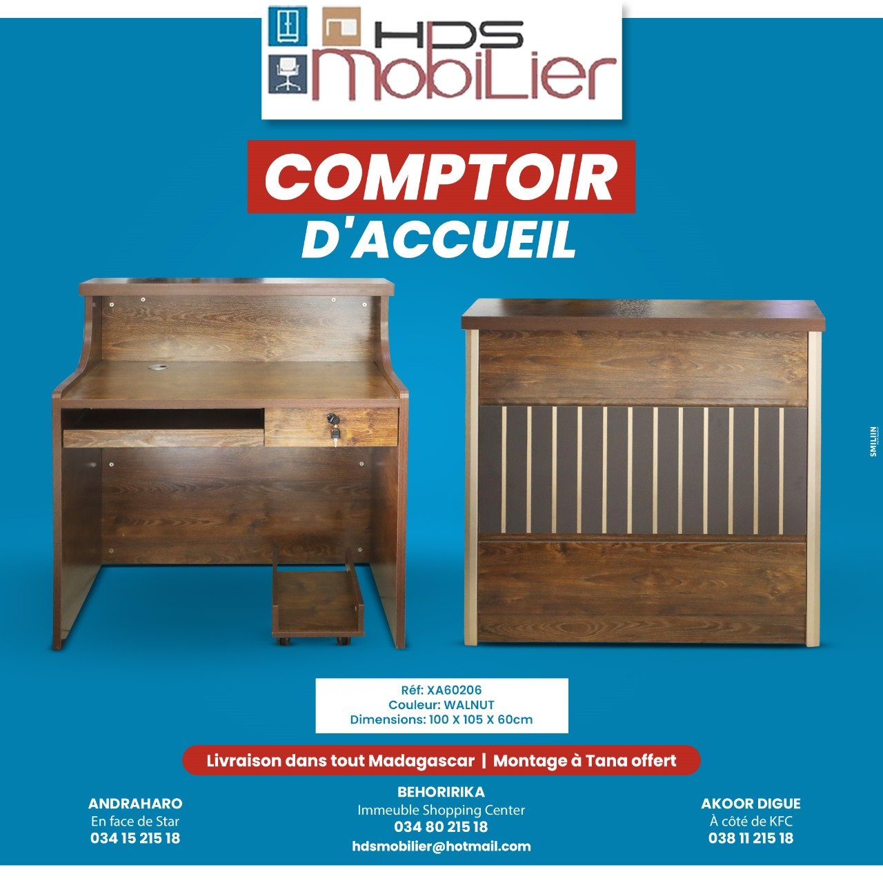 Il s’agit d’une publicité pour un comptoir d’accueil . Le comptoir est en couleur noyer (walnut) et ses dimensions sont 100 cm de longueur, 60 cm de hauteur et 75cm de profondeur.
