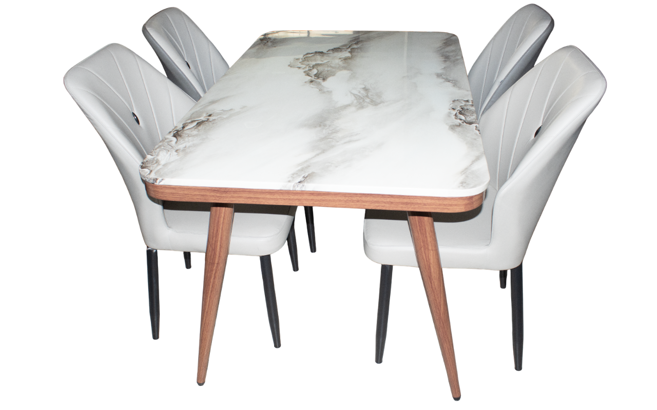 Apportez une touche naturelle et moderne à votre intérieur avec l’ensemble HJ-1163. Sa table rectangulaire combine un plateau effet marbre et une structure imitation bois, créant une ambiance chaleureuse et raffinée. Les chaises HJ-A32, en revêtement gris doux, offrent un excellent confort d’assise et une allure élégante.