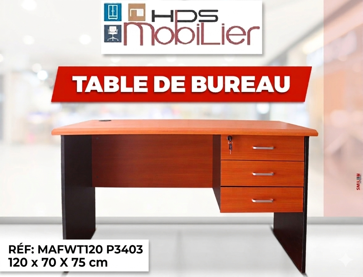 Table de bureau en bois avec 3 tiroirs fermés à clé, en coloris Cherry, avec option de livraison dans tout Madagascar et montage offert à Tana.